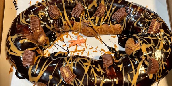 The King Cake has Peanut Butter Filling with Chocolate Chips on the inside along with cinnamon and sugar, topped with Chocolate icing and a peanut drizzle. As well as a few Reese's Cups.