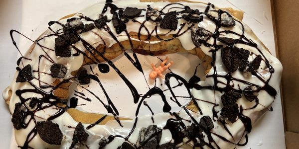 The King Cake has Cream Cheese Filling with Crumbed Oreos on the inside along with cinnamon and sugar, topped with White Icing and Oreo Pieces, then drizzled with Chocolate.