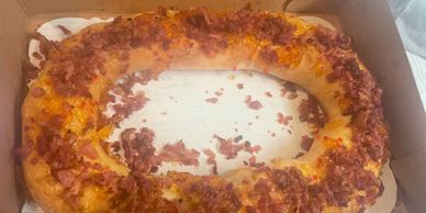 The King Cake is filled with Cajun Boudin. Glazed with Pepper Jelly and topped with Bacon Bits.